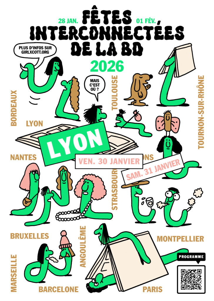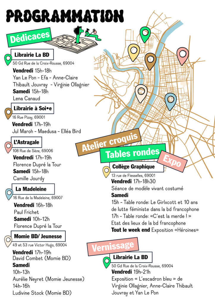 | PARCOURS DÉDICACES Vendredi 30 janvier 15 h – 18 h : Yan Le Pon / Efa / Virginie Ollagnier / Anne Clair Thibault Jouvray (Librairie La BD) 16 h – 18 h : Paul Frichet (La Madeleine) 17 h – 19 h : Jul Maroh / Maedusa / Elléa Bird (Librairie à Soi•e) 17 h – 19 h : Florence Dupré la Tour (L’Astragale) 17 h – 19 h : David Combet (Momie) Samedi 31 janvier 10 h – 12 h : Florence Dupré la Tour (La Madeleine) 10 h – 13 h : Aurélie Neyret (Momie) 14 h – 16 h : Ludivine (Momie) 15 h – 18 h : Lena Canaud (Librairie La BD) 15 h – 18 h : Camille Jourdy (L’Astragale) SÉANCE DE CROQUIS COSTUMES, THÉMATIQUE « TANK GIRL » Vendredi 30 janvier de 17h à 18h30 Au Collège Graphique, 13 Rue de Flesselles, 69001 Lyon (Accès plain-pied) Croquis Costumés est une séance de modèle vivant thématique et costumée, présentée par l’autrice de BD Marie Avril. Ouvert à tous les artistes, amateurs et professionnels. Modèle : Didi Pattes de Velours 10€ / 30 personnes max / Réservation sur Helloasso : https://www.helloasso.com/associations/lepicerie-sequentielle/evenements/croquis-costumes Découvrir les séances sur l’Instagram @croquis.costumes VERNISSAGE DE L’EXPOSITION « L’ESCADRON BLEU » Vendredi 30 janvier 19 h – 21 h : À la librairie La BD, 50 Gd Rue de la Croix-Rousse, 69004 Lyon (Accès plain-pied) TABLES RONDES Samedi 31 janvier Tout l’après-midi au Collège Graphique, 13 Rue de Flesselles, 69001 Lyon (Accès plain-pied) 15 h : Le Girlcott et 10 ans de lutte féministe dans la bande dessinée francophone 17 h : « C’est la merde ! » État des lieux du marché de la bande dessinée francophone EXPOSITION « HEROÏNES » Vendredi 30 et samedi 31 janvier Au Collège Graphique, 13 Rue de Flesselles, 69001 Lyon (Accès plain-pied) Accessible gratuitement pendant les heures d’ouverture du Collège Graphique, les après-midi |