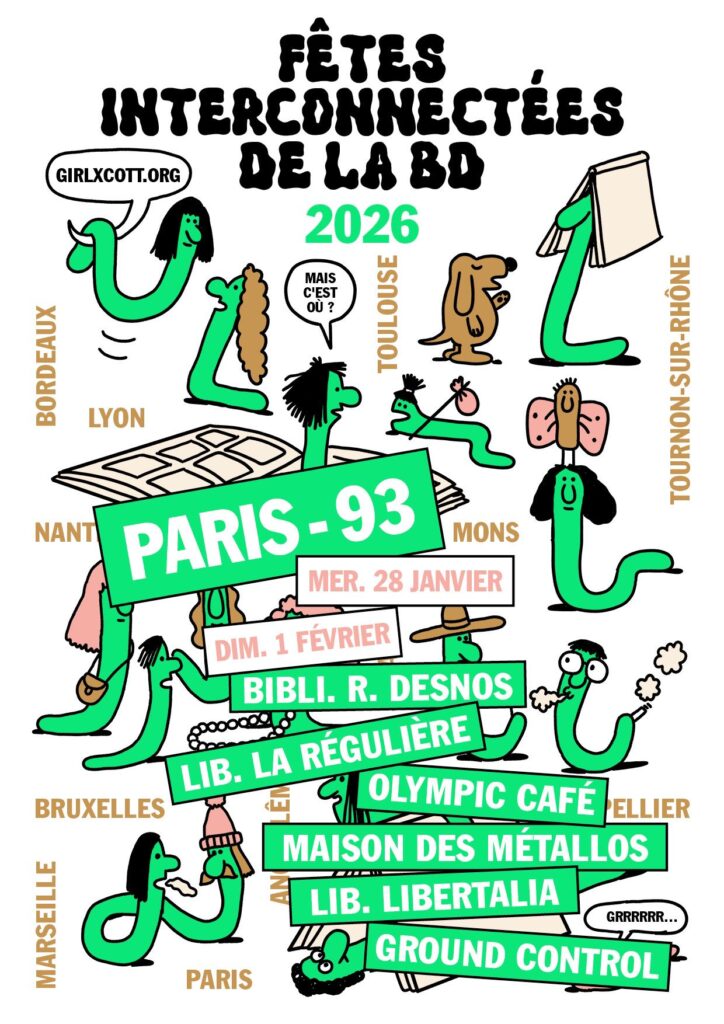 | Mercredi 28 janvier à 18 h : Bibliothèque Robert Desnos, Montreuil Les Fêtes Interconnectées de la BD seront l’évènement phare de cette fin janvier ! Initié en réaction aux divers problèmes traversant le Festival d’Angoulême, cet évènement alternatif d’envergure nationale sera porté localement par l’ensemble des acteur·ice·s du secteur.La bibliothèque Robert-Desnos est heureuse d’intégrer la programmation de ces Fêtes côté Paris, en accueillant en ses murs certaines actrices du mouvement Girlxcott, le mercredi 28 janvier à 18h. Au programme : une table-ronde animée par la journaliste Lucie Servin, regroupant les autrices Sophie Darcq, Marie-Paule Noël et Elsa Abderhamani, pour un échange autour des sujets débattus par la profession, notamment statut et rémunération des auteurices de bande dessinée. Jeudi 29 janvier : Librairie La Régulière, Paris 18e 16 h : atelier de vitrine participative avec des auteurices du Girlxcott – accès libre et gratuit 18 h 30 : table-ronde avec : Elsa Abderhamani, autrice et professeure de BD, Nora Bouazzouni, autrice et traductrice -syndicaliste au STAA, Marie-Paule Noël, traductrice-correctrice – syndicaliste au STAA, Catherine Staebler, éditrice (Biscoto édition) – accès libre et gratuit 20 h : Apéro à l’Olympic Café, 20 rue Léon 20 h 30 : concert live de Paris Banlieue– prix libre – à Télévision, la salle de concert de l’olympic café 21 h 30 : Concert live de Prise Rapide – prix libre – à Télévision, la salle de concert de l’olympic café Samedi 31 janvier : Les Métallos et la Librairie Libertalia, Paris 11e Ouverture à 14 h : accueil de stands, tombola et rencontres dédicaces à la Librairie Libertalia Rencontres : Sur réservation (gratuit) 14h : Présentation historique et médiatique de la collective Girlxcott par Lucie Servin, journaliste indépendante et lanceuse d’alerte pour l’humanité concernant le Fibd et le Girlxcott. Rencontre 1 : 14 h 30 – 16 h 30 Titre : Intersections et entremêlements féministes dans la bande dessinée Modération : Elsa Abderhamani, autrice et militante Invitées : Melek Zertal, autrice Pénélope Bagieu, autrice Marie-Paule Noël, traductrice et activiste Rencontre 2 : 16 h 45 – 18 h 15 Titre : Comment faire un festival éthique et engagé ? Comment se construit une programmation en prenant en compte les contraintes du territoire et les valeurs véhiculées face un public parfois non initié ? Modération : Alexandra Ramos, podcastrice, animatrice, chargée de communication pour Canal BD & le Pop Women Festival Invitées : Marina Corro, co-fondatrice du festival parisien Formula Bula et présidente de la fédération Club 99 Marie-Paule Noël, présidente du festival de Perros-Guirec, éditrice, traductrice et activiste Nathalie Donikian, directrice littéraire du Salon du Livre et de la Presse Jeunesse de Montreuil? Rencontre 3 : 18 h 30 – 20 h Titre : Communication & positionnement féministe À l’heure où les réseaux sociaux font la loi, comment être communicante pour une entreprise et ses propres projets tout en positionnant ses valeurs féministes. Modération : Alexandra Ramos, podcastrice, animatrice, chargée de communication pour Canal BD & le Pop Women Festival Invitées : Elise Bouché-Tran, chargée de communication Blanche Sabbah, autrice et activiste féministe et écologique Juliette Ratto, community manageuse Dimanche 1er février : Ground Control, Paris 12e Rencontre 1 :14 h 30 -15 h 30 Titre : Identifier, dénoncer, lutter contre les VHMSS Modération : Lucie Servin Dessinatrice : Tiziana Invitées : Marie Bardiaux Vaïente, référente VSS au SNAC, scénariste et militante féministe Marion Dubreuil, journaliste et dessinatrice judiciaires, autrice de Mazan, la traversée du Styx Ellen Salvi, journaliste à Médiapart Hélène Richard, autrice et co-référente VSS au SEA Rencontre 2 : 16 h – 17 h Titre : Guide de survie en territoire sexiste Questionner les comportements qui favorisent les environnements toxiques? Modération : Lisa Mandel Dessinatrice : Alizée De Pin Invitées : Marguerite Demoëte Marion Montaigne, autrice Aude Picault, autrice Rencontre 3 : 17 h 30 – 18 h 30 Titre : What’s next? Le regard de la nouvelle génération sur la création et l’évolution du milieu de la BD Modération : Lucie Servin Dessinatrice : Sophie Couderc Invitées : Salomé Lahoche, autrice Salem, auteur Sixtine Dano, autrice |